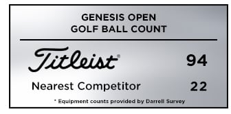 At this week's Genesis Open, Titleist is the overwhelming golf ball of choice with 94 players trusting a Pro V1 or Pro V1x golf ball, more than four times the nearest competitor with 22 and more than all competitors combined.