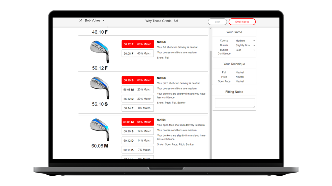 • The app matches data from a player’s technique to various playing conditions to find the right loft, bounce and grind combination for their wedge setup.